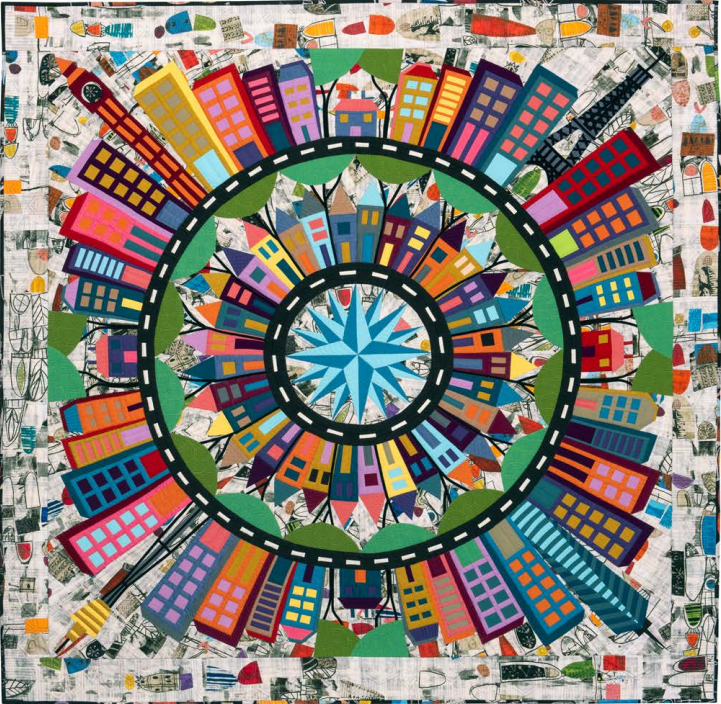 The designer describes this quilt as a reflection of travel and the many places we encounter throughout life. The colorful buildings represent neighborhoods and cities from around the world, while the circular layout symbolizes the journey we take through those places.