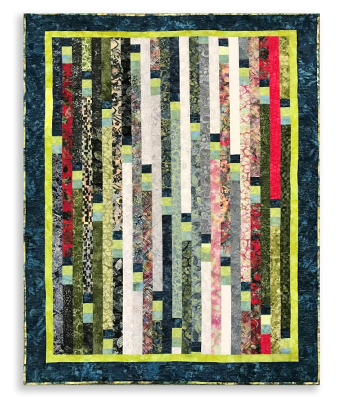 A Jelly Roll Race Quilt is made using a jelly roll, which is a bundle of pre-cut fabric strips usually 2.5 inches wide coordinated within a fabric collection. Instead of sewing individual blocks, you stitch all the strips together end to end, then fold and sew repeatedly until the quilt top reaches the desired size.