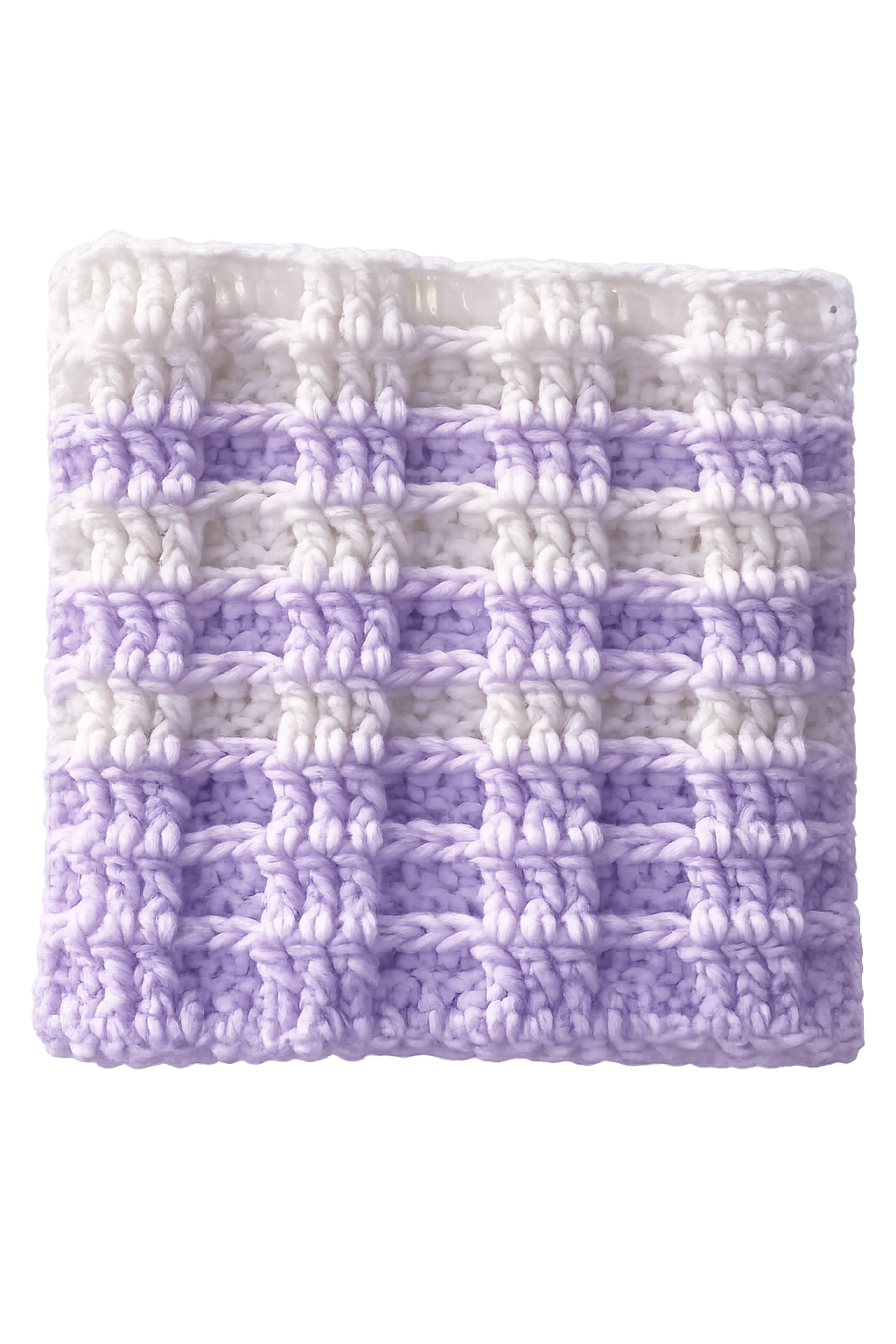 One of the things I love most about this stitch is how versatile it is. It works wonderfully for baby blankets, throws, scarves, and even home décor items like cushion covers. The raised blocks give the fabric a warm, cushioned feel, making it especially popular for projects where comfort and texture are important. Using two colors, like soft white and lilac, highlights the grid design beautifully and adds a gentle, elegant touch to the finished piece.